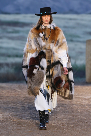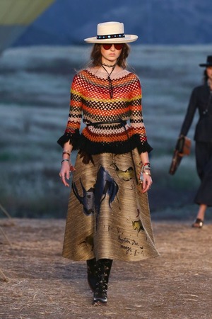 На этот раз под руководством нового креативного директора Dior стал более простым, однако не растерял роскоши и традиционной элегантности. Круизную коллекцию будущего года Мария Граци назвала Dior Sauvage, что идеально раскрывает тему Дикого Запада, читающуюся в каждом образе. Дизайнер вдохновлялась природой американских прерий и культурой проживающих здесь народов. Отсюда и внешняя простота коллекции, и этнический декор, главным образом выраженные через принты, вышивки, россыпи бисера и использование перьев.
