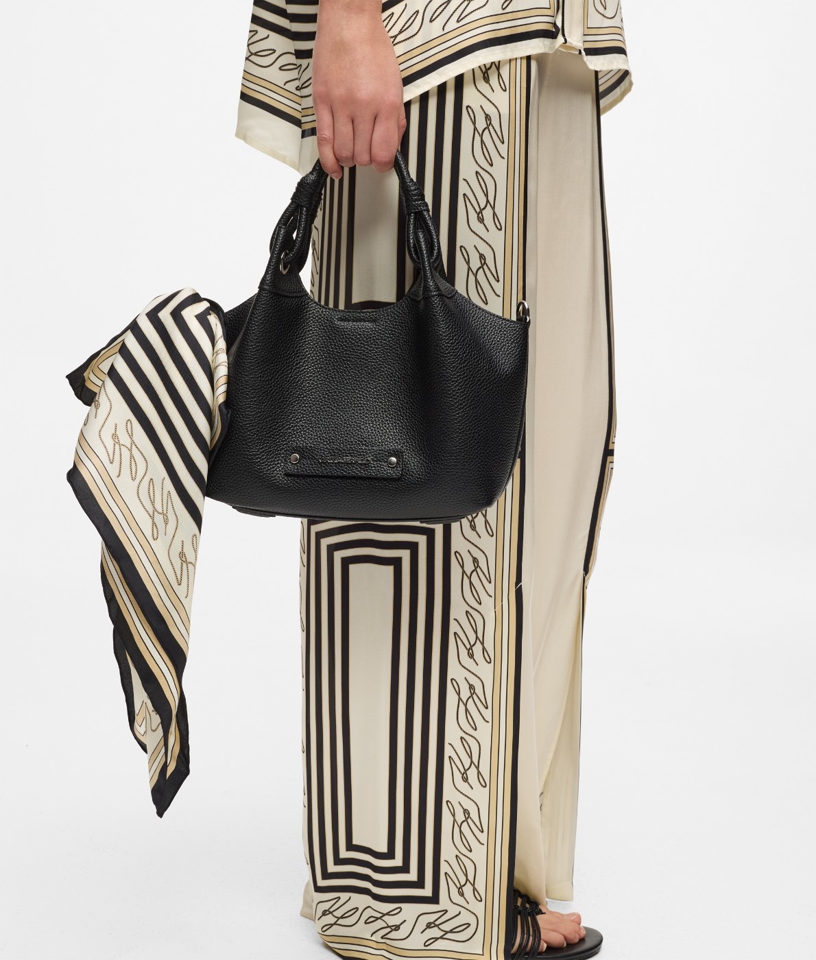 Сумки этого сезона — это игра форм, контрастов и пропорций. Основные модели варьируются от компактных, но выразительных кросс-боди до более вместительных тоутов, органично переходящих из дневного в вечерний ритм. Цветовая палитра объединяет классический черный и солнечные, почти мерцающие оттенки— они отражают свет и создают атмосферу праздника. Размеры подобраны так, чтобы каждая сумка была функциональной без потери эстетики: мини-варианты подходят для элегантного выхода, средние — для повседневных аутфитов, а крупные — для путешествий и динамичного лета.