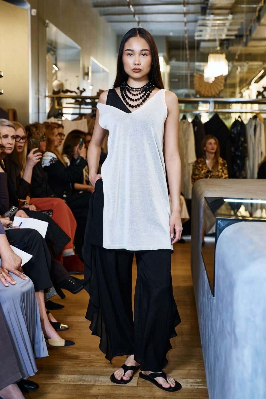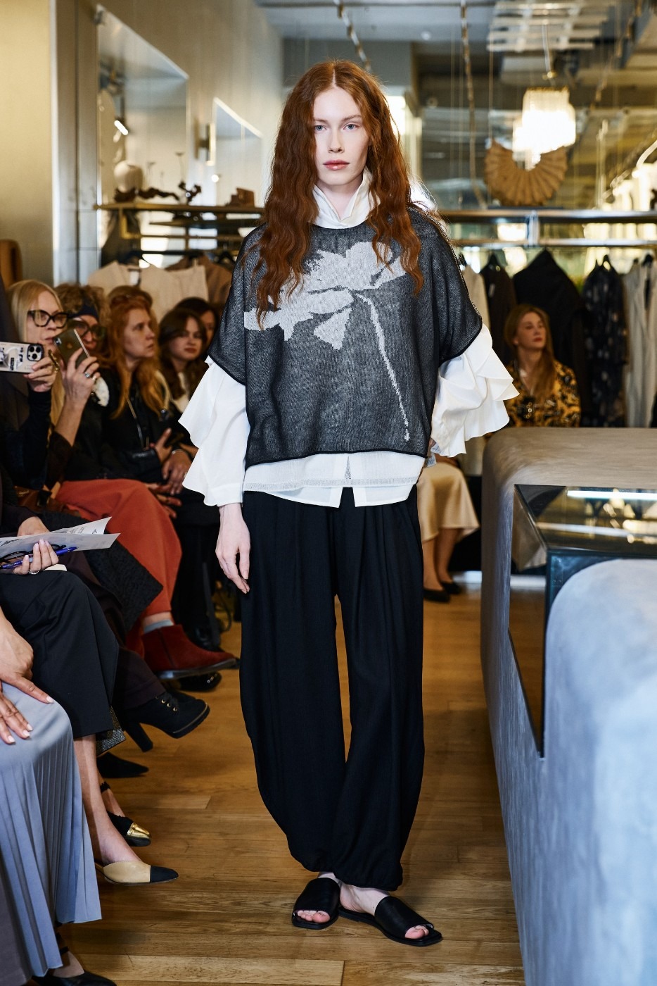 Новая коллекция была представлена гостям в формате транк-шоу с комментариями основательницы и главного дизайнера бренда Ларисы Владимировой. Многослойные образы были стилизованы из узнаваемых моделей бренда – жакетов с округлыми увеличенными рукавами, широких брюк, летящих платьев, юбок и накидок, тончайшего трикотажа-паутинок и топов с ажурными узорами крупной вязки.
