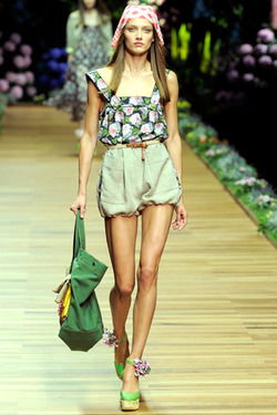 Мелкие цветочные узоры, став основой новой коллекции D&G, украсили буквально каждую модель – и длинные, легкие летние сарафаны, и кокетливые шорты, и укороченные топы, и короткие летние платьица. Впрочем, для тех, кому цветочные узоры уже приелись, дизайнеры предусмотрели и другие варианты – например, узор в контрастную красно-белую клетку на укороченных летних брюках и платьях, или даже топы с изображениями героев диснеевской сказки «Белоснежка и семь гномов».