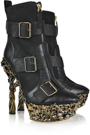 Предлагаем вам взглянуть на сапоги из осенней коллекции Alexander McQueen. Примечательны они, как часто это бывает с обувью от Alexander McQueen, каблуками. 15 сантиметров чистой красоты. Металлические, с цветочной гравировкой, они приковывают внимание. В продолжении можно рассмотреть детали - они того стоят.