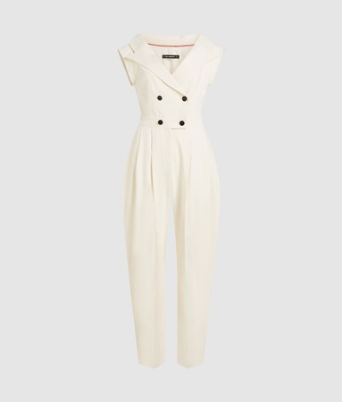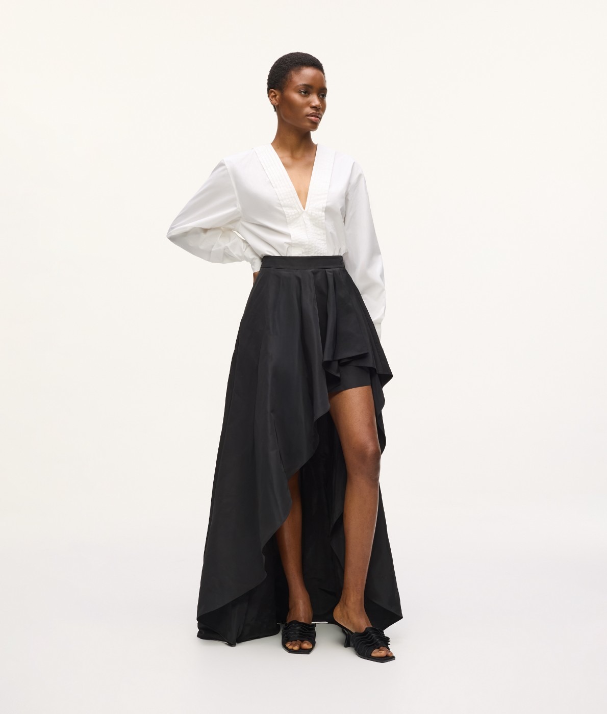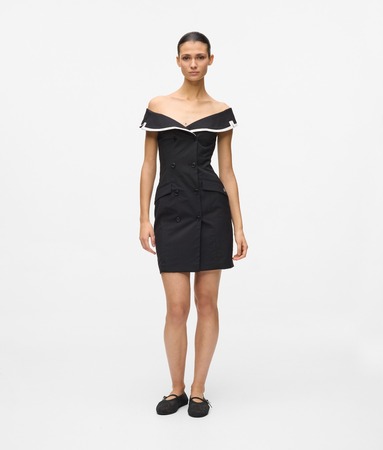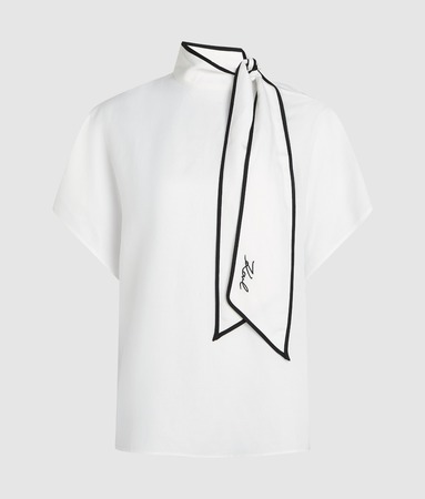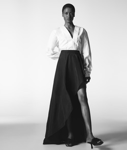 Контрастное сочетание светлого тона и темной отделки — еще один прием, обращающий на себя внимание. Графичные модели молочного цвета объединены четким декоративным элементом, главным визуальным фокусом: черная окантовка прорисовывает силуэт, придавая ему стройность и собранность. Комплект с рубашкой и брюками — прекрасная альтернатива летнему костюму: свободный по форме, но точный по линиям. Платье с игриво раскрывающейся юбкой интригует, а лаконичный топ с узким шарфом привносит легкий ретро-оттенок