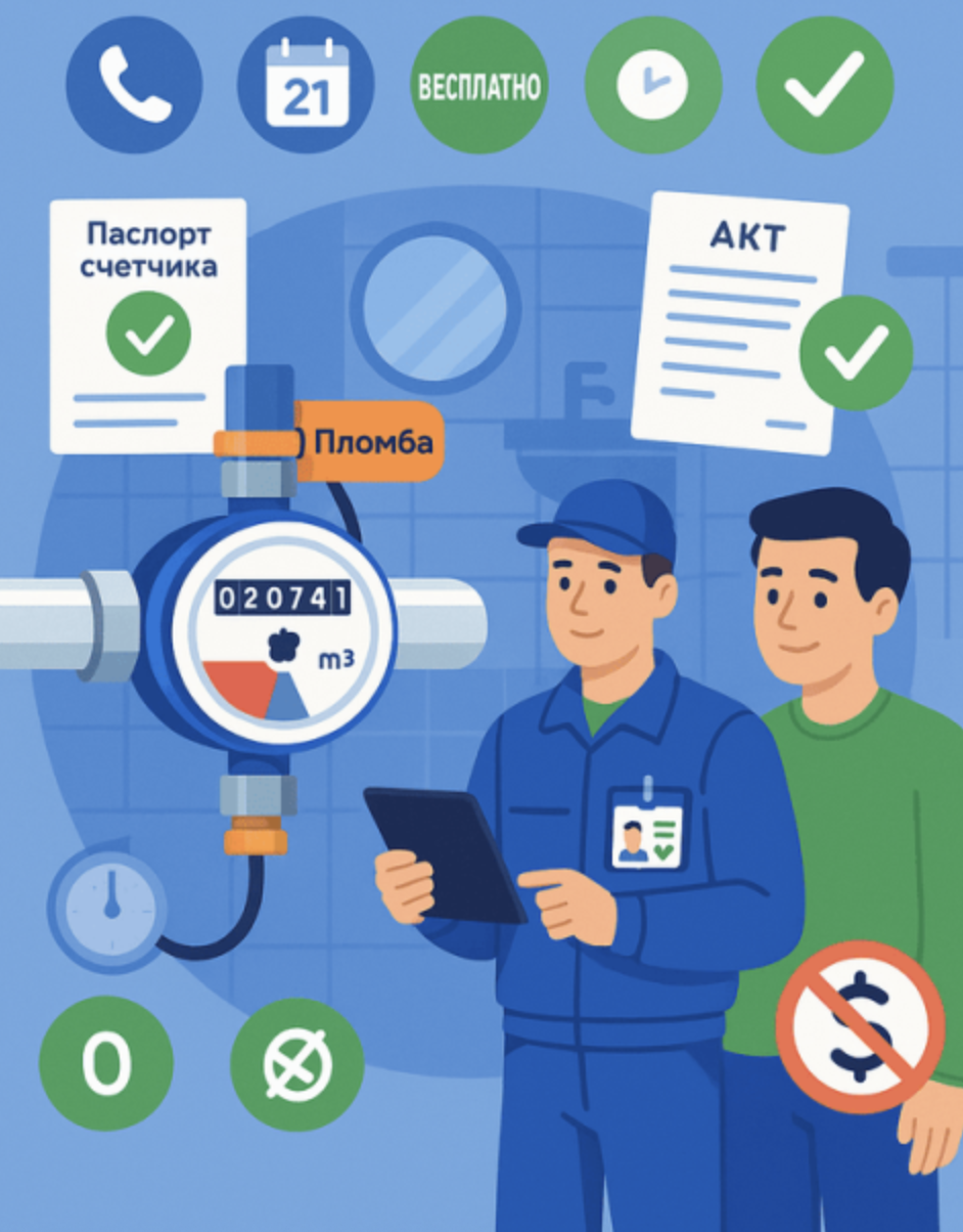 - Контролер: имеет служебное удостоверение, работает по заявке, составляет акт, пломбирует бесплатно