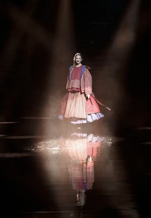 Вспомним, как это проявилось в коллекции от университета имени А. Н. Косыгина: лучи света, которые напомнили рассвет у бабушки в деревне, народные песни, буквально пропущенные сквозь вены каждого, и сама коллекция из мануфактурных тканей прошлых веков от «Шуйских ситцев». Фишка – босоногие модели, вид которых также возвращает в беззаботное детство.
