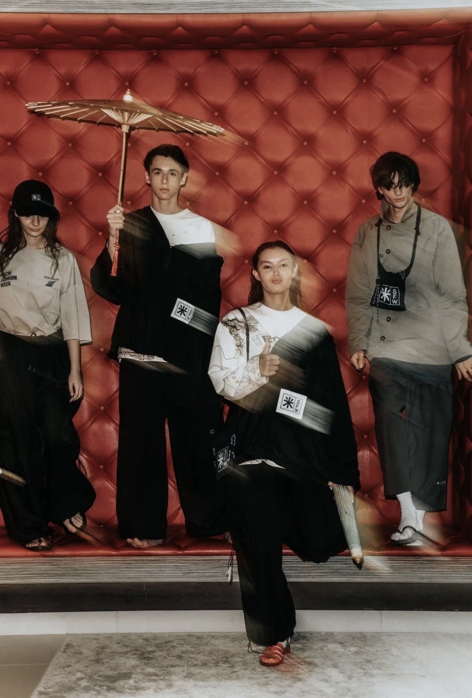 Отметим хедлайнера этого вечера – бренд RICE, который уже по-родному встречает аудитория. Это был не показ, а целое шоу паназиатской культуры с традиционными зонтами и креативными проходками.