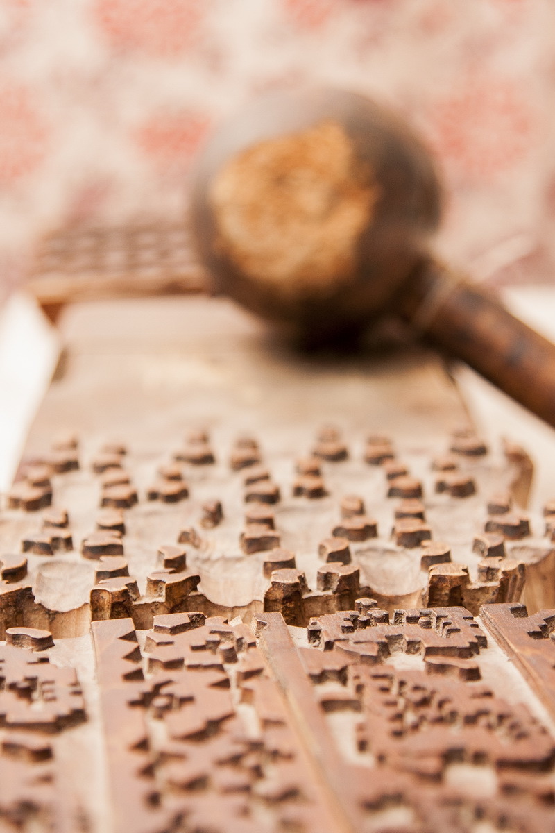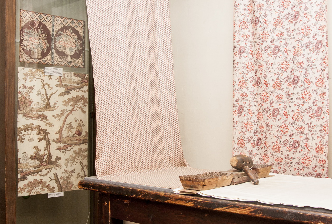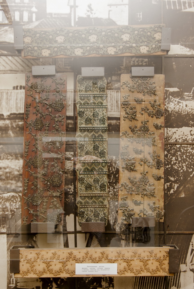 Показана история окраски тканей. Под стеклом справа - уникальные доски - манеры, которые использовались для нанесения рисунка нa ткань. На манеру наносились естественные красители, а способ покраски назывался набивным.