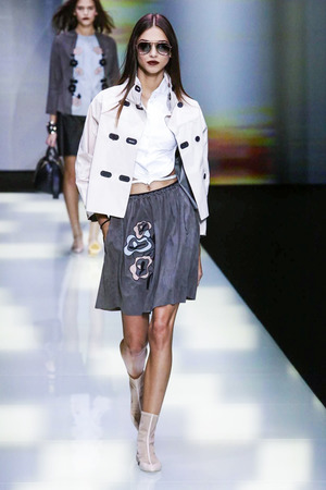 Шоу началось с цветочных аппликаций и принтов, которые Армани использовал в 1970-х, и закончилось пастельной цветовой гаммой, по которой мы узнаем дизайнера сегодня. Здесь же можно было увидеть легендарные негабаритные двубортные пиджаки, с огромными серьгами-дисками. Отдельным номером программы выступили кожаные куртки с лазерной резкой, тренчи в клоунскую полоску и футболки с принтами-смайлами. Эпоха сменяла эпоху, а гости продолжали листать архивы Emporio Armani.