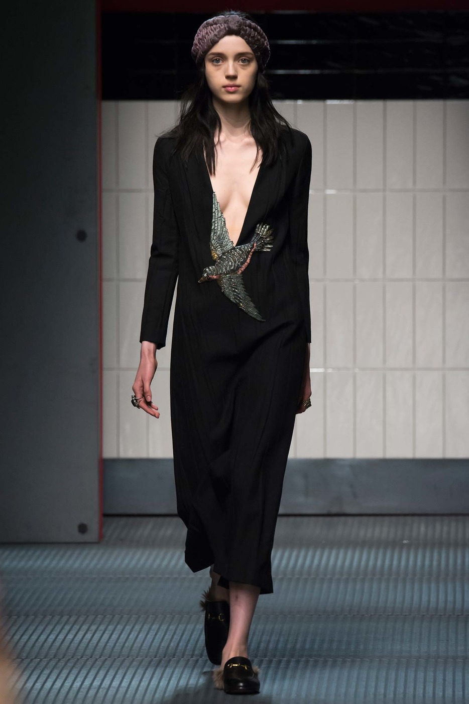 Победа или провал — третьего не дано. От первой коллекции Алессандро Мишеля (Alessandro Michele) требовалось, как минимум, чудо. И, похоже, модельеру удалось его совершить. Осень и зима 2015-16 от Gucci, не смотря на то, что им выпало открывать неделю моды в Милане вместе с новичками и молодыми дизайнерами в этом году, — без сомнения одна из самых влиятельных коллекций будущего сезона. У кодов Gucci давно не было столь оригинального, рискованного, даже легкомысленного, прочтения.