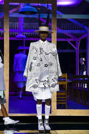 Размышляя о будущем сезоне, Том Браун взял за основу школьную форму, но переработал ее в свойственной ему бунтарской манере. При этом о классическом портновском мастерстве дизайнер, как всегда, не забывает. От Брауна-сюрреалиста здесь остались разве что косы в виде рогов, пробивающие макушки соломенных канотье. Школьная форма же у него превратилась в многослойные, но строгие наряды, которые дополнительно оживляли рисунки, плиссированные юбки и сумки в виде рыб.