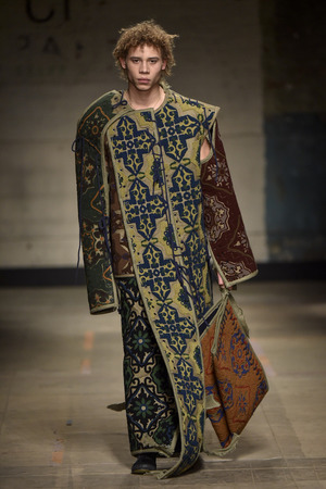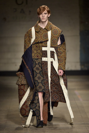 Отдельного внимания заслуживает декоративные элементы коллекции. Твидовые куртки и пальто дизайнер дважды опоясывает толстыми жгутами. За нужное настроение отвечает и приглушенная палитра в духе военно-морского флота: от темно-серого до мутного сиреневого и хаки. Некоторые модели расшиты узорами, о которых Грин рассказал, что они вдохновлены коврами традиционных ирландских пабов. Свободно свисающие панели и многослойность дают эффект прочной брони.