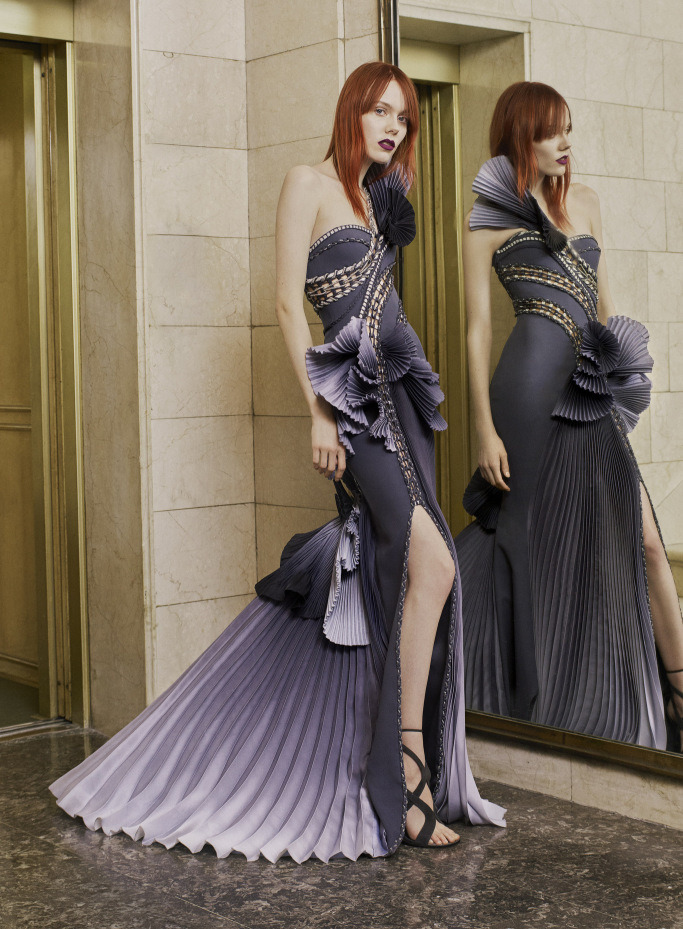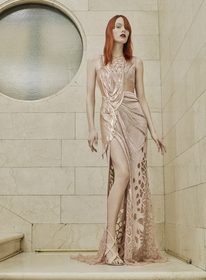 Главными мотивами новой коллекции Atelier Versace стали узлы, складки и металлические детали. Все эти элементы Версаче постаралась совмещать в каждом наряде и создала почти мифологические образы. Нежные и драматичные драпировки напоминают об образах древних богинь, которыми, по мнению Донателлы, должны стать современные девушки. Плиссированный тюль, металлическая сетка, чистая геометрия линий – все это говорит о силе героини новой коллекции итальянского дома.