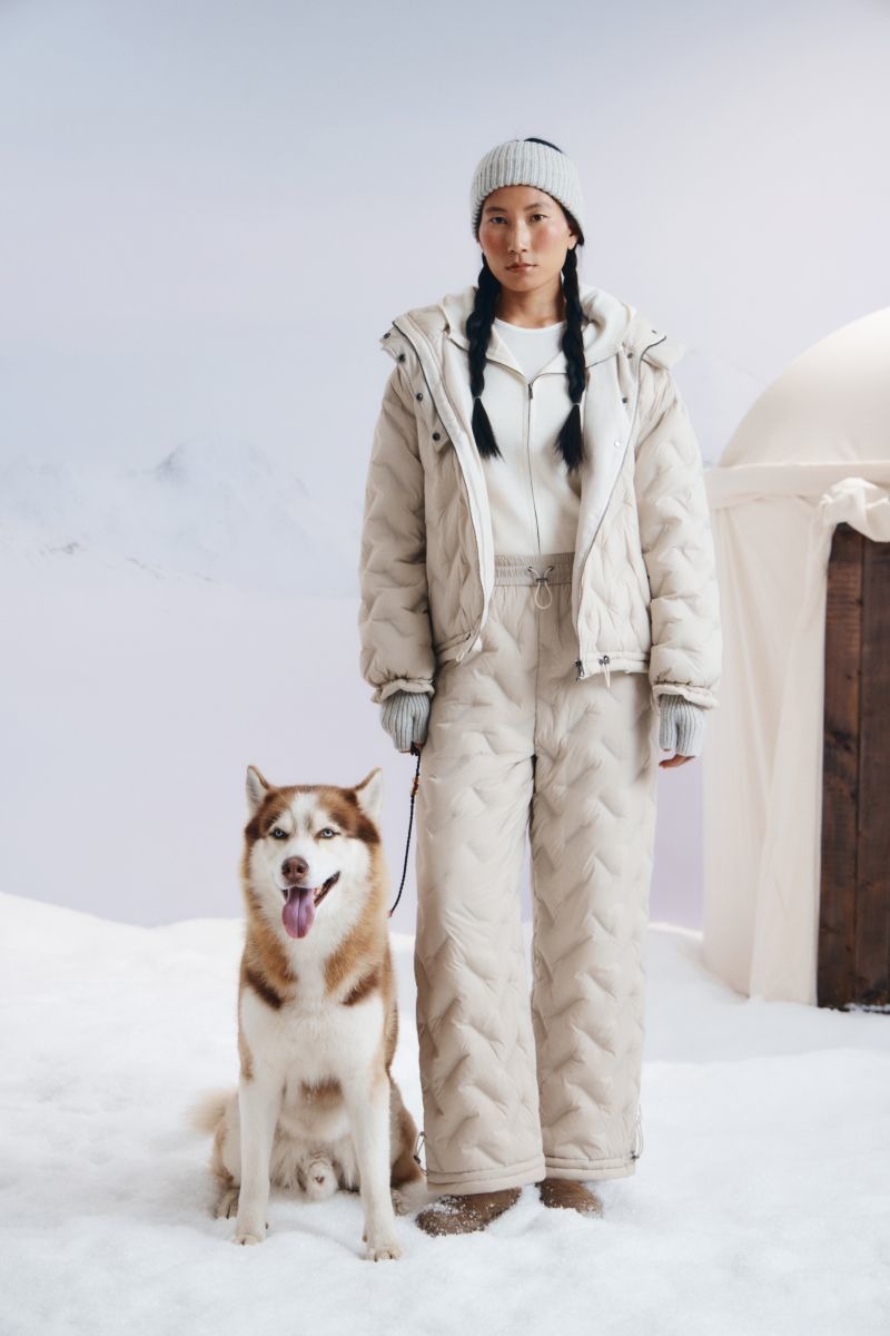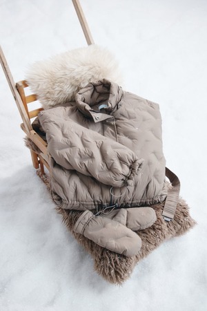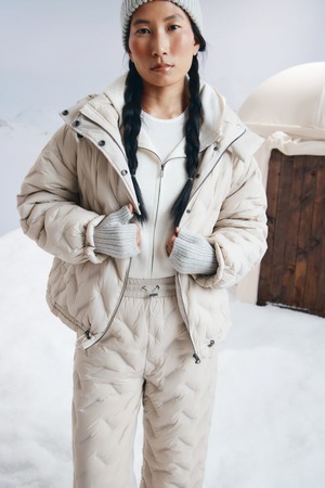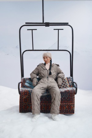 - Комбинезон с капюшоном и застежкой на молнию — модель c пуховым наполнителем, регулируется на талии с помощью эластичного шнура и стопперов (скоро в продаже).