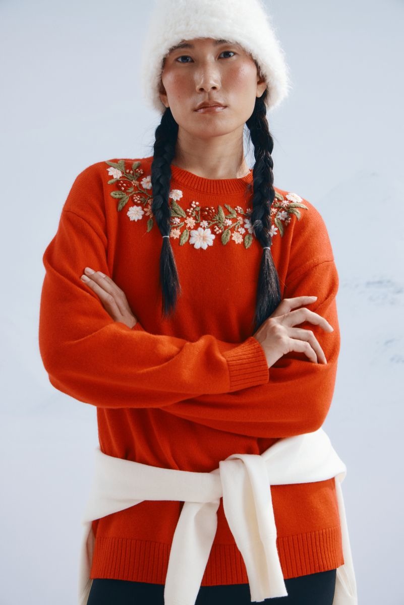 - Джемпер из шерсти с авторской вышивкой — благодаря яркому цвету и декору станет акцентным элементом теплого образа (скоро в продаже).