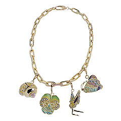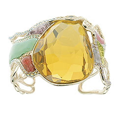 Комплект “Amalgame” же ассоциируется с образами тайного сада, где эльфы, божьи коровки, бабочки и цветы живут в полной гармонии. Красивейшие амулеты из кристаллов и эмали навевают мистическое настроение. Комплект “Ambassador”, состоящий из кольца, ожерелья, клипс и сумочки, выполнен в орнаментальном стиле, с органическими и асимметричными формами, характерными для ар нуво. Цитрин и золото сплетены с другими кристаллами, как с листьями и цветами.
