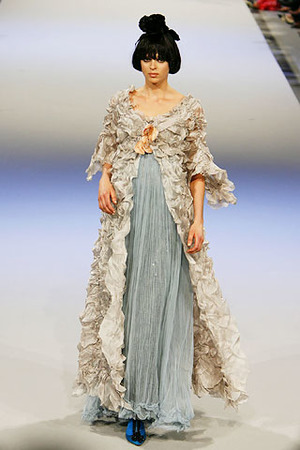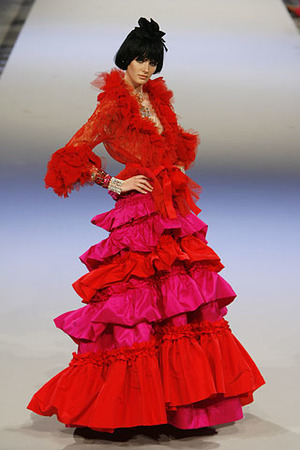 В новом сезоне Lacroix предпочел открыть ноги и скрыть талию, добавив текучий объем: пальто яйцеобразной формы, платья из дамаста (ткань парчового типа) с куполообразными юбками и без бретелек, экстравагантные каракулевые накидки. Круглые рукава в стиле Ренессанса хорошо дополняют платья а-ля инфанта. Позолота, ламе, ленты, облака тюли и волны тафты – каким-то чудом, спустя 20 долгих лет в моде Christian Lacroix не просто в форме, но и на коне.