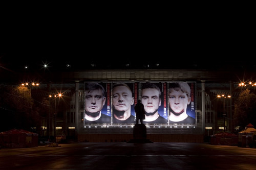 Сегодня ночью, в преддверие долгожданного матча Россия - Англия на стадионе "Лужники" появились огромные плакаты с портретами знаковых российских футболистов.