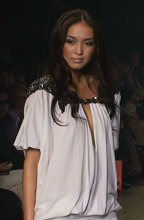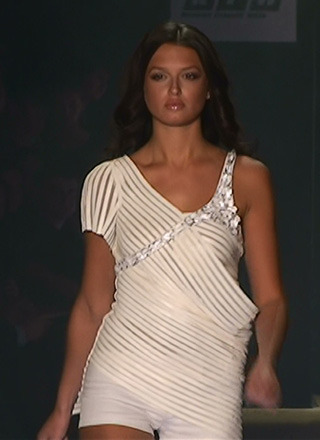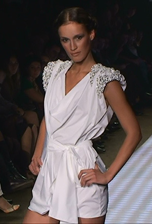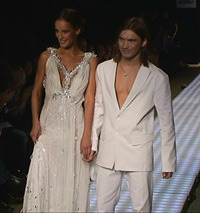 Заявленная тема коллекции, название которой Shiny можно перевести как «Блестящая», в полной мере нашла свое отражение в украшениях из горного хрусталя, рассыпанных на складках белого платья подобно росе на лепестках орхидей. Но, прежде всего блестящим во всех смыслах было оформление показа. Даже те его части, которые почти наверняка оказались скрытыми от зрительских глаз - вроде черных с красной окантовкой тореодорских панталон (на подиуме они оказались полностью закрыты длинным платьем), – были продуманы до мельчайших деталей.