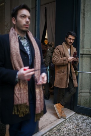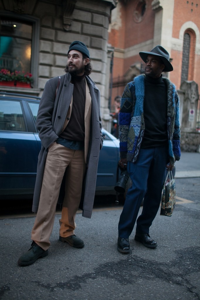 Холодный сезон диктует свои правила, поэтому парни выбирали натуральные теплые ткани – шерсть, кашемир и твид, а также кожу и мех. Не обошлось без многослойности, крупных шарфов и накидок, а также пальто, парок и курток. Впрочем, некоторые миланские жители показали свое нежелание мириться с погодой и разгуливали в довольно легких нарядах и обуви. Отдельного внимания, как всегда, заслуживает выбор аксессуаров. Здесь можно было увидеть и предметы из актуальных коллекций, и винтажные стильные вещи.