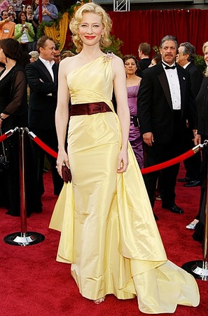 Если платье Пенелопы Круз было примером баланса, то платье Кейт Бленчетт (Cate Blanchett), выбранное актрисой для появления на красной дорожке «Оскара», стало самым что ни на есть удачным примером сочетания контрастных цветов. Создателю платья, Валентино Гаравани, удалось превратить рискованное сочетание мягкого желтого оттенка и роскошного оттенка бургундского в незабываемую яркую комбинацию.