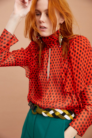 Что касается модельного ряда, то коллекция основана на повседневной одежде с заметным влиянием глэм-рока 1970-х годов. Струящиеся наряды, щедро декорированные, порой напоминают о сценических образах Стиви Никс. Но Сондерс помнит о своем фирменном стиле, поэтому не погружается в культуру хиппи с головой и использует любимую классику: горох, пледовую клетку, полоски и пейсли. В итоге получилась очень разнообразная и эклектичная коллекция.