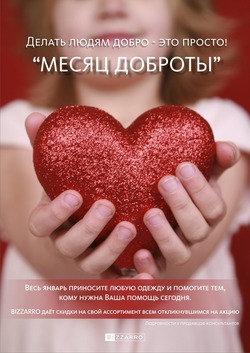 Весь январь в сети магазинов BIZZARRO будет проходить акция: «Месяц доброты», в ходе которой каждый может совершить доброе дело и помочь нуждающимся семьям. В январе в магазинах BIZZARRO будут работать пункты по сбору одежды для нуждающихся семей. Приносите любую пригодную к носке одежду и помогите тем, кому нужна Ваша помощь сегодня.