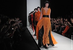 Светлана Тегин впервые за долгое время позволила рассмотреть свою коллекцию на стандартном подиуме при нормальном освещении - коллекция от этого, естественно, не проиграла. Выбрав в качестве базовых цветов черный и немного серого, оранжевый и фиолетовый, дизайнер использует их в минималистичном духе: не более двух в образе и только чистые цвета.