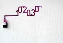 Настенный календарь от Диаза состоит из специального стенда и бутылочки с чернилами. В начале каждого месяца в полную бутылочку опускается полоска особой бумаги, по которой благодаря капиллярному эффекту с определенной скоростью поднимается краска, расцвечивая нужные цифры на стенде.