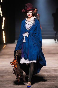 Знаменитая Vivienne Westwood: перед ее творчеством Вы можете преклоняться, можете не любить, можете считать гениальным или наоборот лишенным всякого смысла. Но Вы совершенно точно запомните ее неповторимый стиль и узнаете из тысячи. Основательница течения «панк» в одежде в очередной раз подтвердила свою уникальность на Парижской неделе моды. Новая коллекция Vivienne Westwood как всегда отличалась эпатажностью и яркостью, заставляя удивляться каждой ее детали. Модели, на губах которых сверкала красная помада, и лицо было украшено нарисованными усами, казалось бы, недавно очнулись после длительного празднования. Но с этой бесшабашностью и небрежностью умело сочеталась какая-то педантичность и аристократизм – смесь «синего чулка» и freak-культуры. Создавалось ощущение, что молодые особы, уставшие от однотонных будней и светских приемов, решили совместить несовместимое: искусно скроенные платья и взъерошенные шубы, элементы строгого костюма и кислотные чулки, классические болеро и футболки с принтами. Шикарные наряды скрывались под длинными накидками, очень похожими на пледы, придавая коллекции еще большую многослойность и оставляя зрителям поле для размышлений. Ведь фантазия для поклонников Vivienne Westwood является незаменимым элементом, связывая их необычный внутренний мир с яркой индивидуальностью внешней «упаковки».