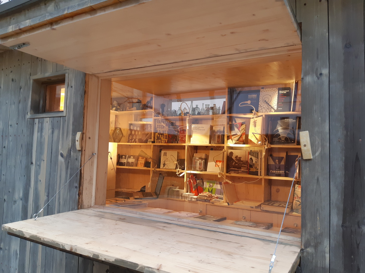 На верхних полках киоска можно увидеть фрагменты металлических изделий, керамических и стеклянных предметов XIX-XX веков, которые были обнаружены в ходе благоустройства двора музея.