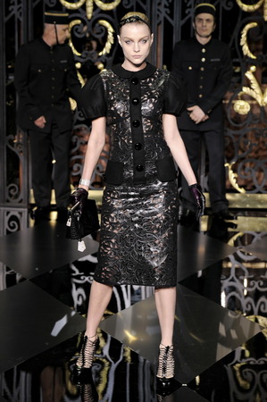 Завершение парижской недели моды ознаменовала коллекция Дома Louis Vuitton, выгодно отличающаяся от всех остальных дефиле своим размахом. Специально для показа был выстроен огромный чёрный павильон с мраморными лестницами и резными старинными лифтами, из которых выходили модели, облачённые в достаточно провокационную и чувственную одежду. Дом терпимости в стиле барокко с присущим ему цветом бордо, прекрасно сочетающимся с тёмно-зелёным, чёрным и шоколадным. Мягкий мех и бархат контрастируют здесь со строго держащей заданную форму лакированной кожей. Прозрачная юбка-карандаш с широким поясом в форме трапеции открывает взгляду стройные ноги. Марк Джейкобс (Marc Jacobs) добавляет и в эту коллекцию свою любовь к 50-тым, создавая несколько платьев в стиле эпохи в мелкий принт с белым закруглённым воротничком. Важными деталями сезона стали крупные пуговицы, фуражки и чулки. «Рабыне любви» причитается также и сумка Louis Vuitton из крокодильей кожи, пристёгнутая к запястью браслетом в форме наручников, уже сегодня ставшие в Париже настоящим бестселлером следующей зимы. Лидия Бардина — Lidia Bardina Photos: Chris Moore/Ludwig Bonnet http://russian.fashionreporters.com/