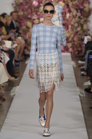 Коллекция весны-лета 2015 от Oscar de la Renta разбита на несколько тематических серий, следующих одна за другой. Показ начинали прогулочные и загородные наряды из ткани в клетку — очень традиционные и памятные еще по американской рекламе 50-х годов. Таковы же и силуэты — ничего броского, слишком открытого или прозрачного, не смотря на то, что основной дублирующий материал хлопка здесь — крупное белое кружево. Некоторые вещи действительно напоминают домашний текстиль и дополнение их шитьем и рищелье лишь усиливает эффект. И только мастерский крой и жесткий баланс сочетаемости позволяют добиваться нежного, ностальгического настроения, не смотря на заведомо рискованную отсылку.