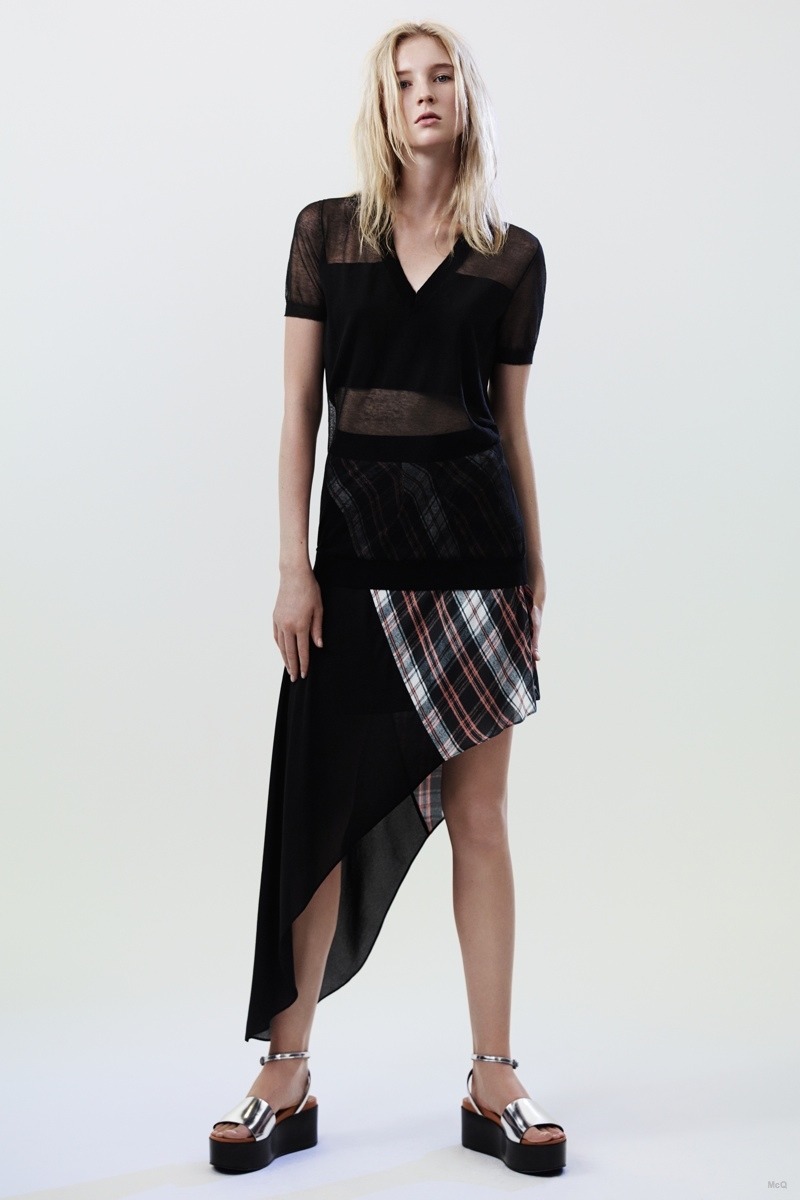 Черный и белый, бывшие фаворитами прошлой весны, введены дозировано и по отдельности. Молодежная мода, на которую ориентированы McQ by Alexander McQueen, не скоро будет готова променять их универсальную многозадачность на что-то более свежее или классическое. На первый план, однако, выведен серый, с которым одинаково хорошо сочетаются и золотистые, и серебристые оттенки. Много внимания уделено абстракции в принтах, создающей на тонких тканях эффект полупрозрачного кружева и легкой ажурной вязки; одним штрихом дана клетка — возможно, ближе к лету ее станет больше. Трикотаж фактурной вязки, очень популярный в коллекциях зимы 2015, здесь почти не используется, оставаясь только в топах-безрукавках и платьях-чехлах.