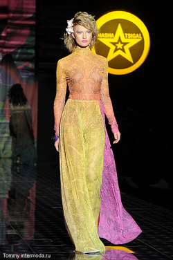 Основной элемент коллекции - ткани с принтами: яркие цветы, тропические растения, экзотические птицы "оживают" на легких шифоновых комбинезонах, платьях и юбках. Буйство красок уравновешивают монохромные олимпийки, будто снятые с мужского плеча, шорты, драпированные юбки.