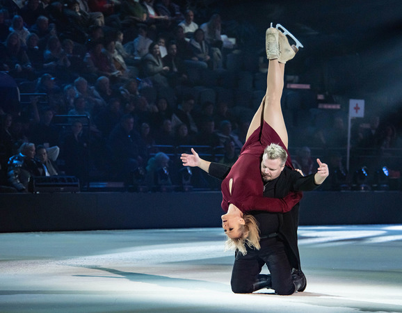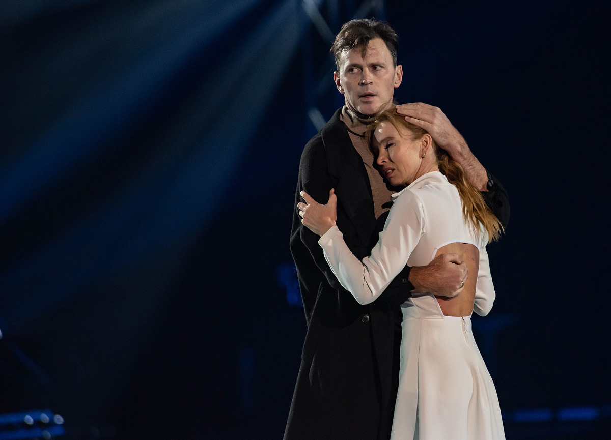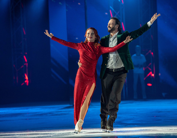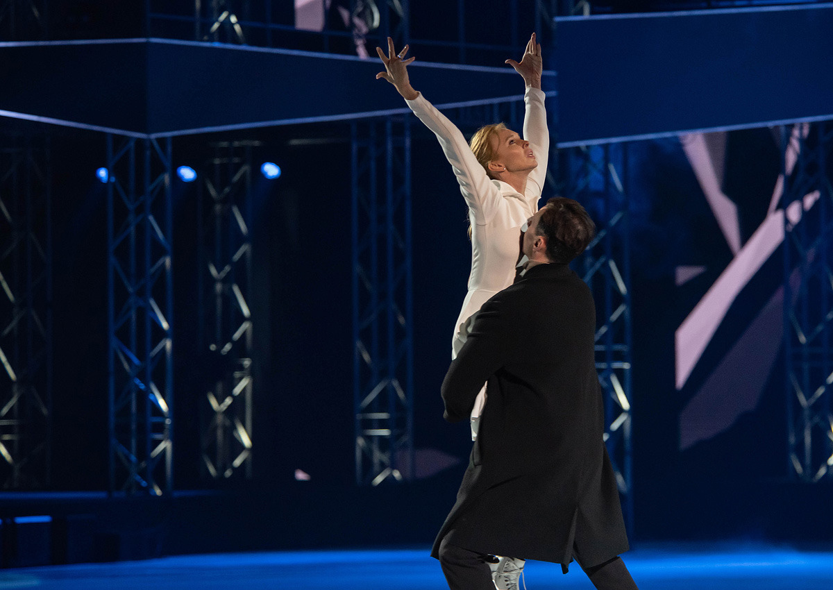 В номере «Ангел» Роман Костомаров появился на льду на коньках и станцевал с верной супругой Оксаной Домниной, чья поддержка помогает ему преодолеть самые страшные испытания. Публика стоя приветствовала фигуриста!